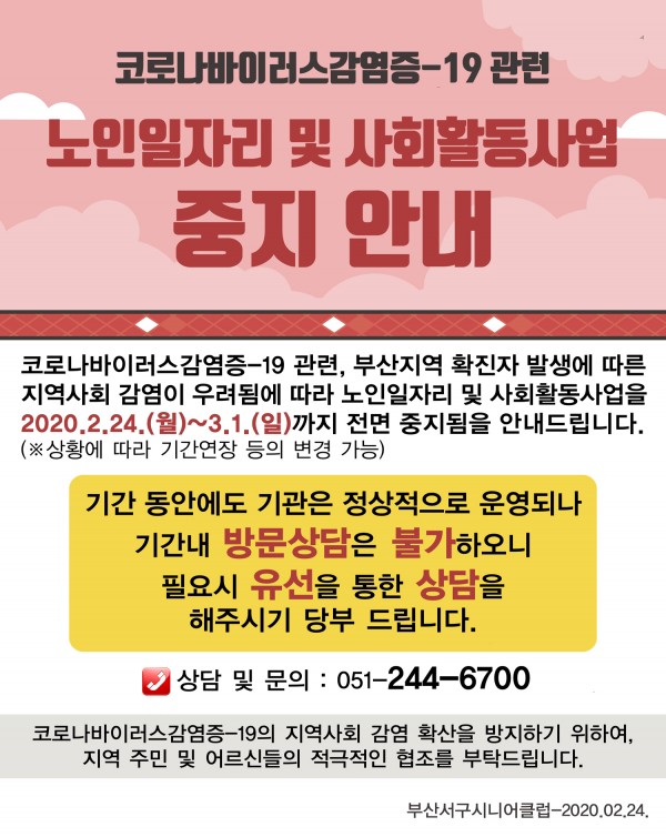 2020.2.24.(월)~3.1.(일) 까지 노인일자리 및 사회활동사업을 붙임과 같이 한시적으로 중지함을 안내드립니다.