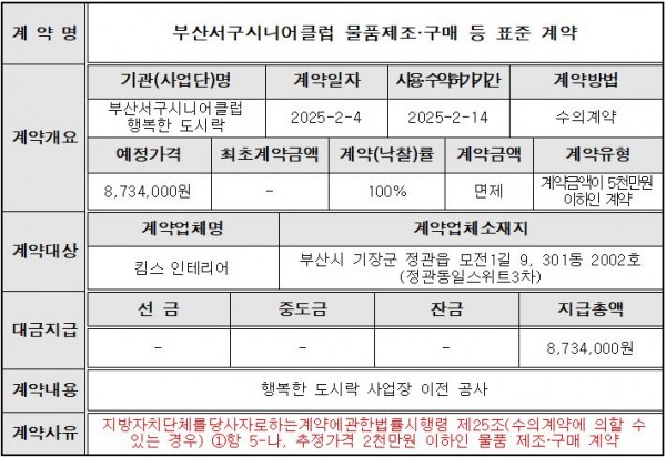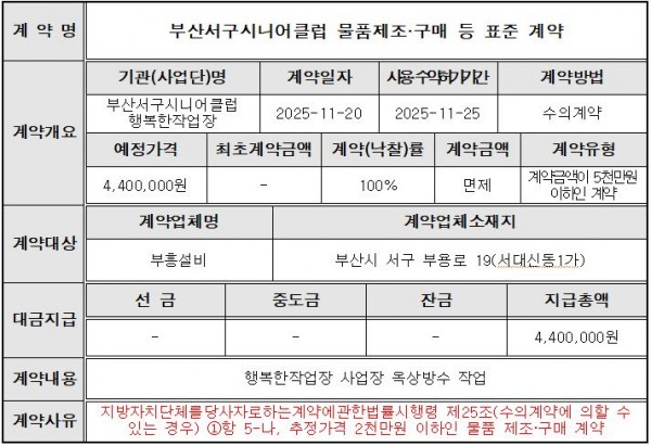 공지사항 HOME 커뮤니티 공지사항 공유하기 인쇄하기 부산서구시니어클럽 2025년 수의 계약 정보 공개 페이지 정보 작성자 부산서구시니어클럽 댓글 0건 조회 1,805회 작성일 26-01-07 19:13 본문 . 목록 이전글2026년 부산서구시니어클럽 정규직 신입 사회복지사 채용 공고 26.02.05 다음글부산서구시니어클럽 2026년 세입세출 예산서 공고 25.12.24 댓글목록 댓글목록 등록된 댓글이 없습니다.
