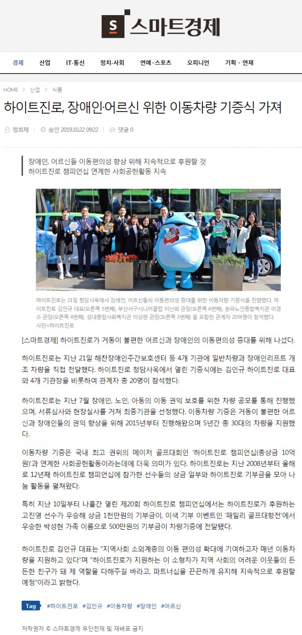 [언론보도:스마트경제]하이트진로, 장애인ㆍ어르신 위한 이동차량 기증식 가져