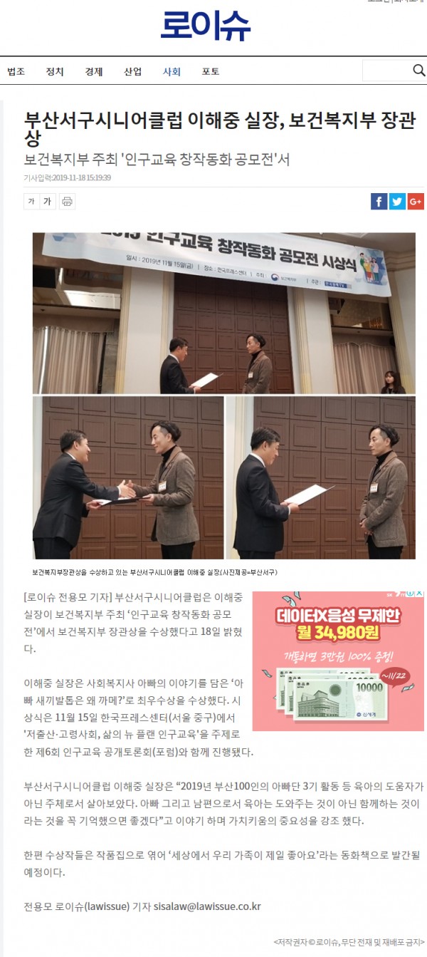 [언론보도:로이슈]부산서구시니어클럽 이해중 실장, 보건복지부 장관상
