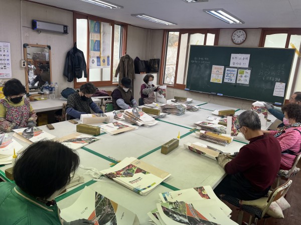 행복한작업장사업단 참여자 어르신들 빨래집게 조립 및 쇼핑백 작업하는 사진입니다.