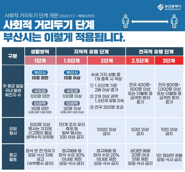 '사회적 거리두기 단계' 부산시는 이렇게 적용됩니다. 페이지 정보 작성자 부산서구시니어클럽 댓글 0건 조회 11,845회 작성일 20-11-24 15:00 본문 사회적 거리두기 단계 개편(2020.11.07.~해제시까지) 목록 이전글부산광역시 코로나19관련 연말연시 특별방역 20.12.28 다음글1단계 사회적거리두기 완화 [부산광역시] 20.10.21 댓글목록 댓글목록 등록된 댓글이 없습니다.