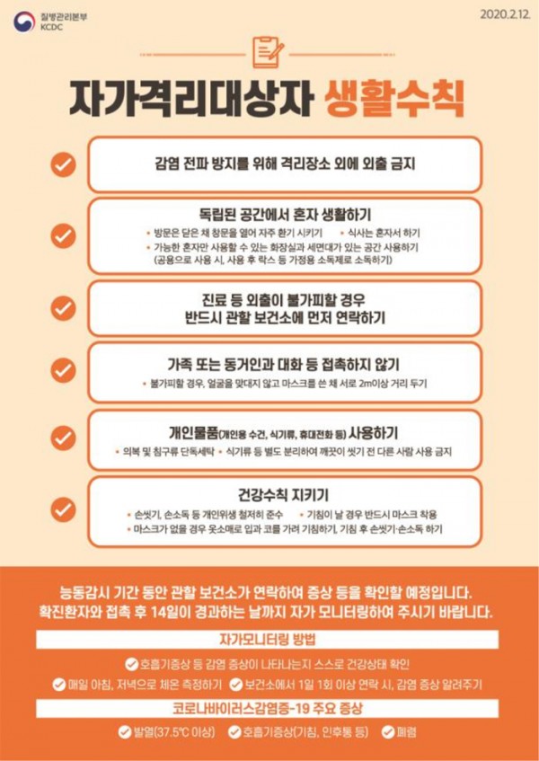 자가격리 대상자 생활수칙 페이지 정보 작성자 부산서구시니어클럽 댓글 0건 조회 11,014회 작성일 20-04-03 11:00 본문 자가격리 대상자 생활수칙 목록 이전글자가격리 대상자 가족 및 동거인 생활수칙 20.04.03 다음글코로나바이러스감염증-19 예방 [꼭! 기억해야 할 행동수칙] 20.04.03 댓글목록 댓글목록 등록된 댓글이 없습니다.