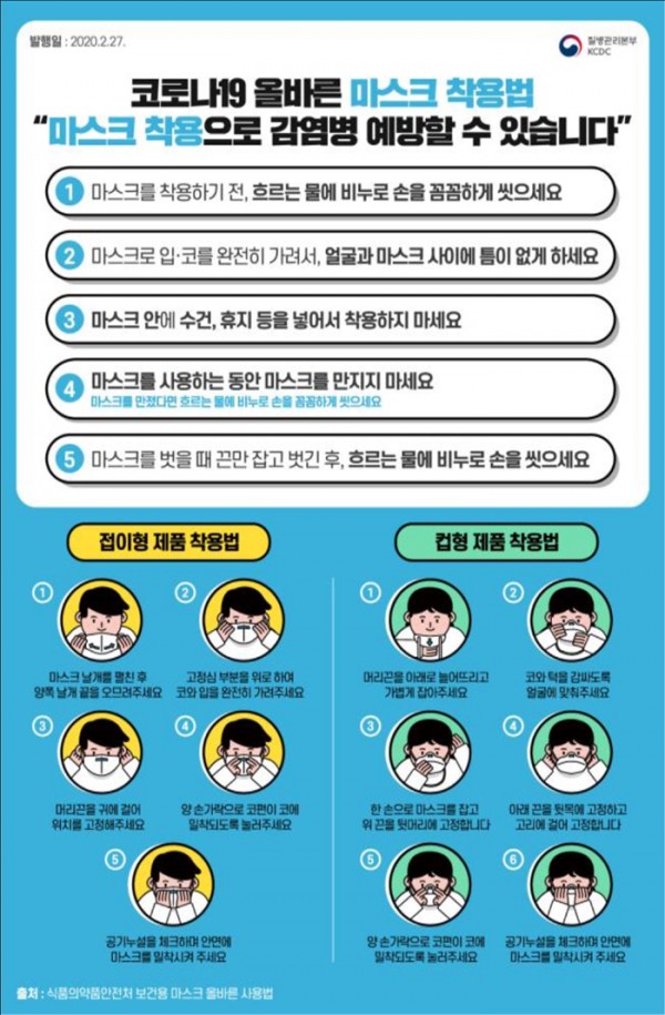 포토에세이 HOME STORY 포토에세이 공유하기 인쇄하기 코로나바이러스감염증-19 예방 [올바른 마스크 착용법] 페이지 정보 작성자 부산서구시니어클럽 댓글 0건 조회 11,064회 작성일 20-04-03 11:02 본문 코로나바이러스감염증-19 예방 [올바른 마스크 착용법] 목록 이전글노인일자리 및 사회활동지원사업 코로나바이러스감염증-19 예방수칙 20.05.06 다음글코로나바이러스감염증-19 예방 [올바른 손씻기 및 기침예절] 20.04.03 댓글목록 댓글목록 등록된 댓글이 없습니다.